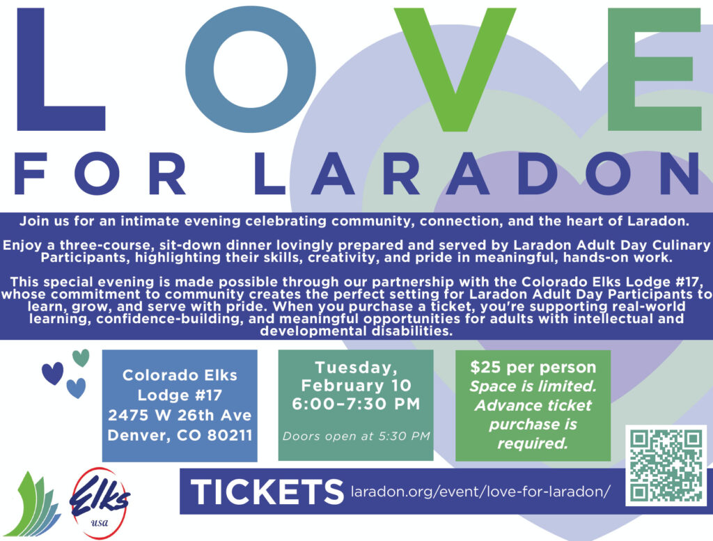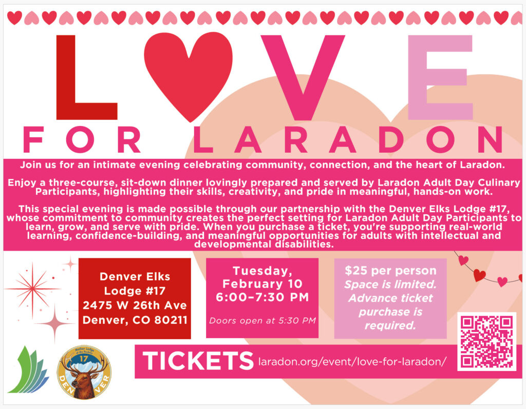 Join us for an intimate evening celebrating community, connection, and the heart of Laradon.Enjoy a three-course, sit-down dinner lovingly prepared and served by Laradon Adult Day Culinary Participants, highlighting their skills, creativity, and pride in meaningful, hands-on work. You’ll also have the chance to hear first-hand from Laradon leaders and individuals about the culinary program, Laradon and the impact it is making on a daily basis.